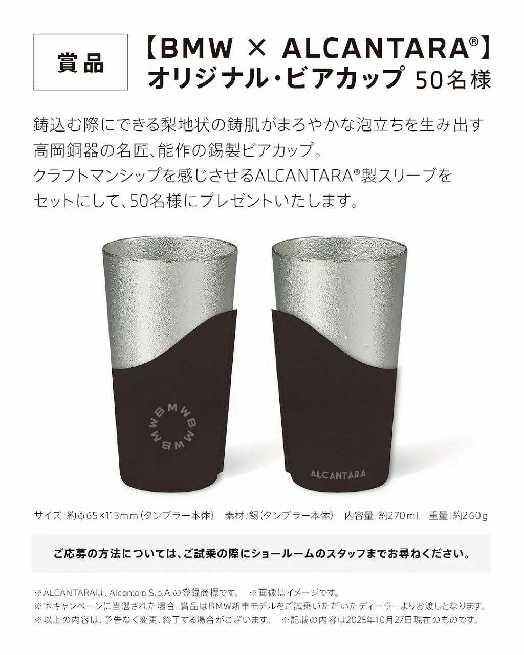【DISCOVER BMW TEST DRIVE CAMPAIGN実施中】フェア期間中、ショールームにて新車モデルをご試乗いただいた方の中から抽選で50名様に、BMWのインテリアにも採用されている上質な手触りのマテリアル「ALCANTARA®」製スリーブを纏ったオリジナル・ビアカップをプレゼントいたします。